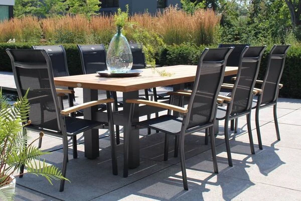- Stapelbarer Sessel mit pulverbeschichtetem Aluminium und FSC®-Teakholz Armlehnen