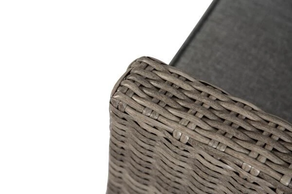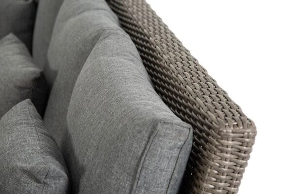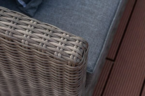 Das Untergestell der Möbel besteht aus pulverbeschichtetem Aluminium, dies macht es nicht nur stabil, sondern sorgt auch dafür, dass es sich aufgrund des relativ geringen Gewichts von insgesamt ca. 68,4 kg ganz leicht hin und her stellen lässt. Das Aluminiumgestell wird mit Polyrattan bespannt. Das halbrunde Geflecht ist in der Farbe grau (Faser w5) gehalten und passt so wunderbar zu allen möglichen Terrasseneinrichtungen. Die gemütlichen Polster (100 % Olefin (200 g/m³)) mit einer Stärke von ca. 10 cm sorgen für höchsten Sitzkomfort. Farblich sind die grau melierten Polster perfekt auf das Geflecht abgestimmt. Die synthetische Faser Olefin wird für ihre Hitzebeständigkeit und optimalen Trage- und Pflegeeigenschaften geschätzt. Sollten Sie einmal Falten in Ihren Polstern haben, werden diese bei Wärme von alleine verschwinden, sodass die Bezüge komplett bügelfrei sind. Textilien aus Olefin sind bequem, hautkühlend, waschbar und bügelfrei. Sie eignen sich perfekt für den Einsatz im Freien, was nicht zuletzt an ihrer wasserabweisenden und atmungsaktiven Materialzusammensetzung liegt.