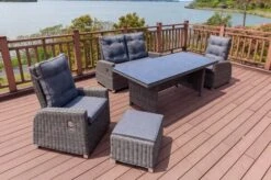 Das Set besteht aus einem 3-Sitzer Loungesofa, 2 Loungesesseln und einem Kaffeetisch und punktet nicht nur mit seinem stylischen Design. Gemütlich können hier bis zu 5 Personen Platz nehmen. Die Sitzflächen sind mit großen und bequemen ca. 20 cm dicken Kissen und Polstern ausgestattet, die zudem auch für einen traumhaften Sitzkomfort sorgen – Ihre Lieben werden begeistert sein. Die Sitzmöbel lassen sich perfekt zusammen als Lounge aufstellen. Sie können die Sessel jedoch auch individuell in Ihrem Garten verteilen – ganz wie Sie mögen. Die Gesamtmaße des Loungesofas liegen bei ca. 237 x 82 x 65 cm. Die Sessel bieten mit Maßen von jeweils ca. 97 x 82 x 65 cm ebenfalls genügend Platz, um einfach die Seele baumeln zu lassen. Der passende moderne Tisch darf natürlich auch nicht fehlen. Mit einer Größe von ca. 123 x 20 x 21 cm bietet er genügend Platz, um entspannt im Kreis der Familie oder mit Freunden ein kühlendes – oder auch wärmendes – Getränk mit Knabbereien und Gebäck im Garten zu genießen.