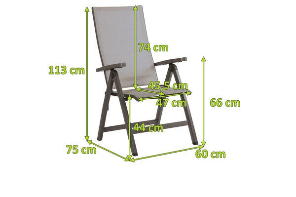 Der Sessel überzeugt nicht nur mit seinem zeitlosen Design und den hochwertigen Materialien, sondern vor allem auch durch seinen Komfort und seine Funktionalität. Schlicht, unauffällig und dennoch ein Hingucker. So lässt sich der New Top wohl am besten beschreiben. Holen Sie sich mit diesem Sessel Eleganz vereint mit perfektem Sitzkomfort nach Hause und genießen Sie entspannte Stunden z.B. nach Ihrem Feierabend. Die hochwertigen Materialien und die sorgfältige Verarbeitung sorgen nicht nur für die besondere Optik dieses Stuhls, sondern machen ihn auch äußerst stabil. Der New Top wird Ihnen durch seine hohe Widerstandsfähigkeit gegen Wind und Wetter viele Jahre Freude bereiten. Das Gestell aus Aluminium ebenso wie das Textilgewebe der Sitzfläche und der Rückenlehne sind besonders pflegeleicht. Die Sitzfläche hat die Farbe silber. Leichte Verschmutzungen lassen sich ganz einfach mit ein wenig Wasser wieder entfernen. Durch seine Klappfunktion und den Maßen von ca. 75 x 60 x 113 cm lässt sich der Stuhl platzsparend verstauen, wenn Sie doch einmal etwas mehr Platz auf Ihrer Terrasse oder im Garten benötigen sollten. Der Klappsessel bietet 5 verschiedene Verstellmöglichkeiten, sodass Sie immer die ideale Sitz/-Liegeposition erreichen.