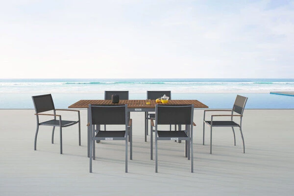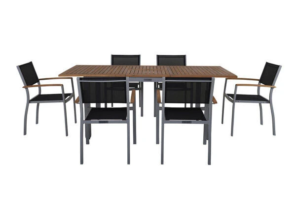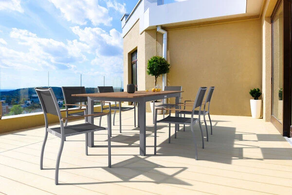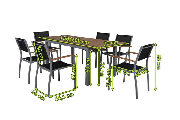 Diese Villana Esstischgruppe bietet genügend Platz für sechs Personen und besitzt auch in Sachen Komfort und Verarbeitung nur die beste Qualität. Die Farb- und Materialkombination aus Silber, Schwarz, Aluminium, Textilene und FSC-Akazienholz sorgt für eine rustikale Eleganz, welche die vielfältige Kombination mit anderen Möbelstücken oder Dekoration ermöglicht. Der Tisch kann bis auf eine Länge von ca. 200 cm ausgezogen werden – perfekt, wenn sich noch spontaner Besuch ankündigt oder Sie einen schönen Grillabend mit Freunden und Nachbarn planen.